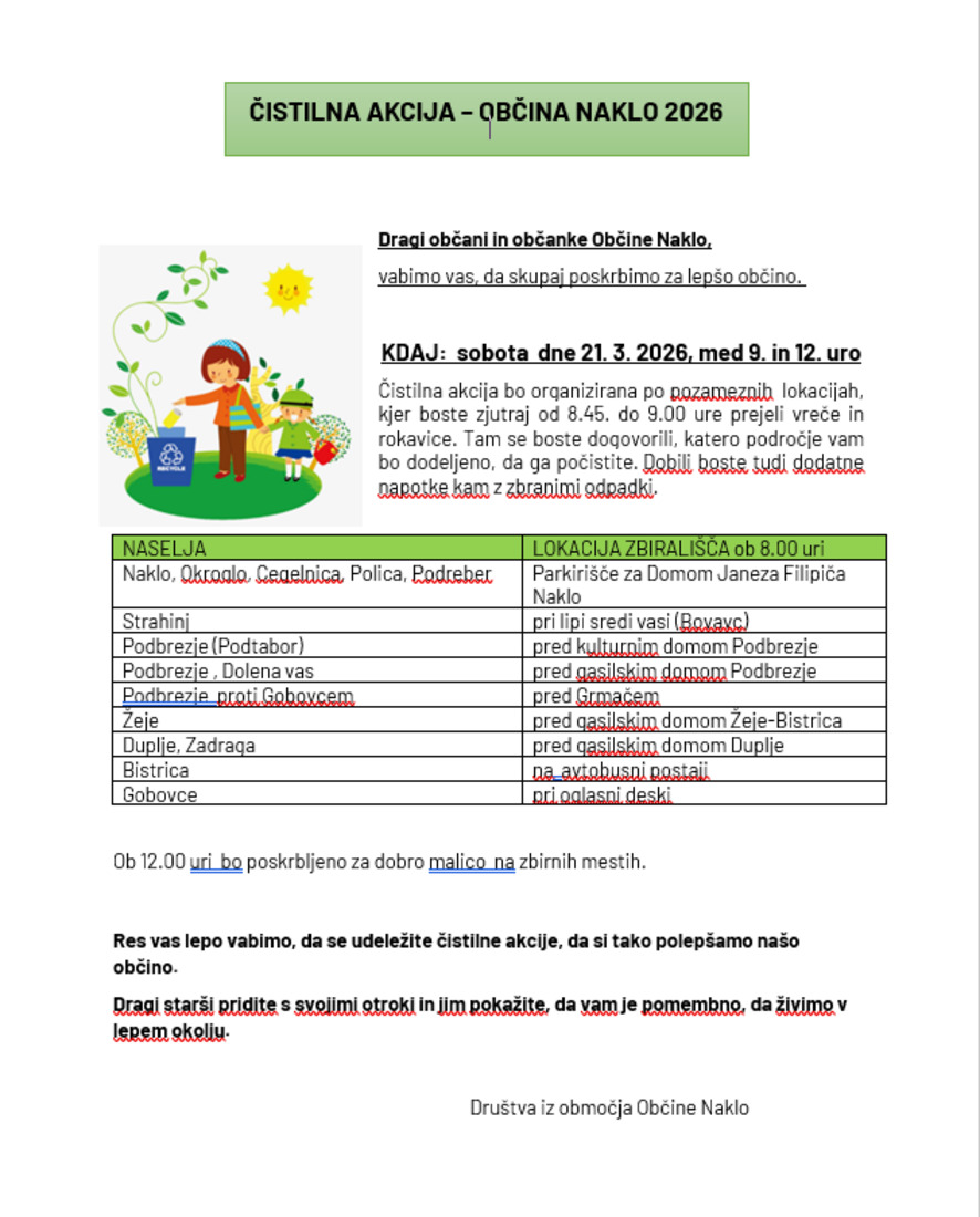 Vabimo vas, da se udeležite čistilne akcije, ki bo potekala v soboto, 21. 3. 2026, med 9. in 12. uro.