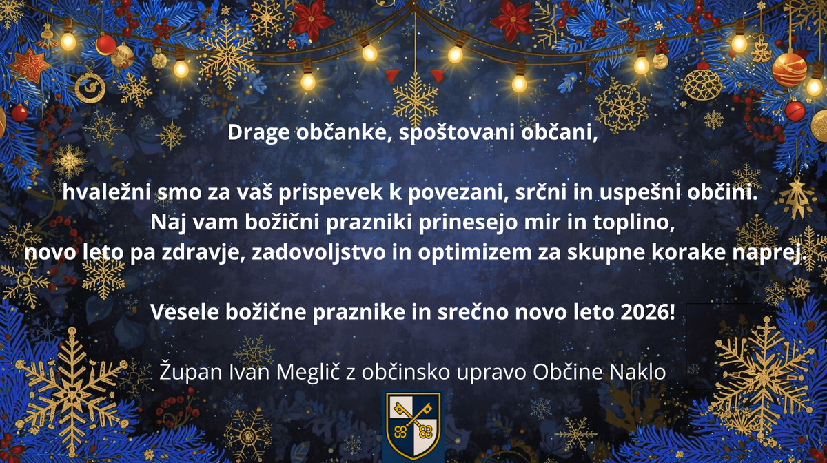 hvaležni smo za vaš prispevek k povezani, srčni in uspešni občini. Naj vam božični prazniki prinesejo mir in toplino, novo leto pa zdravje, zadovoljstvo in optimizem za skupne korake naprej.