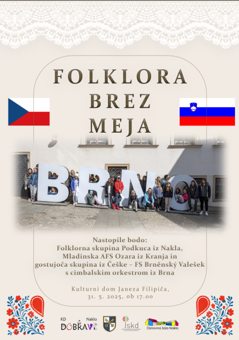 KD Dobrava naklo vabi na folklorno popoldne ''FOLKLORA BREZ MEJA''. Nastopile bodo: Folklorna skupina Podkuca iz Nakla, Mladinska AFS Ozara iz Kranja in gostujoča skupina iz Češke - FS Brněnský Valášek.