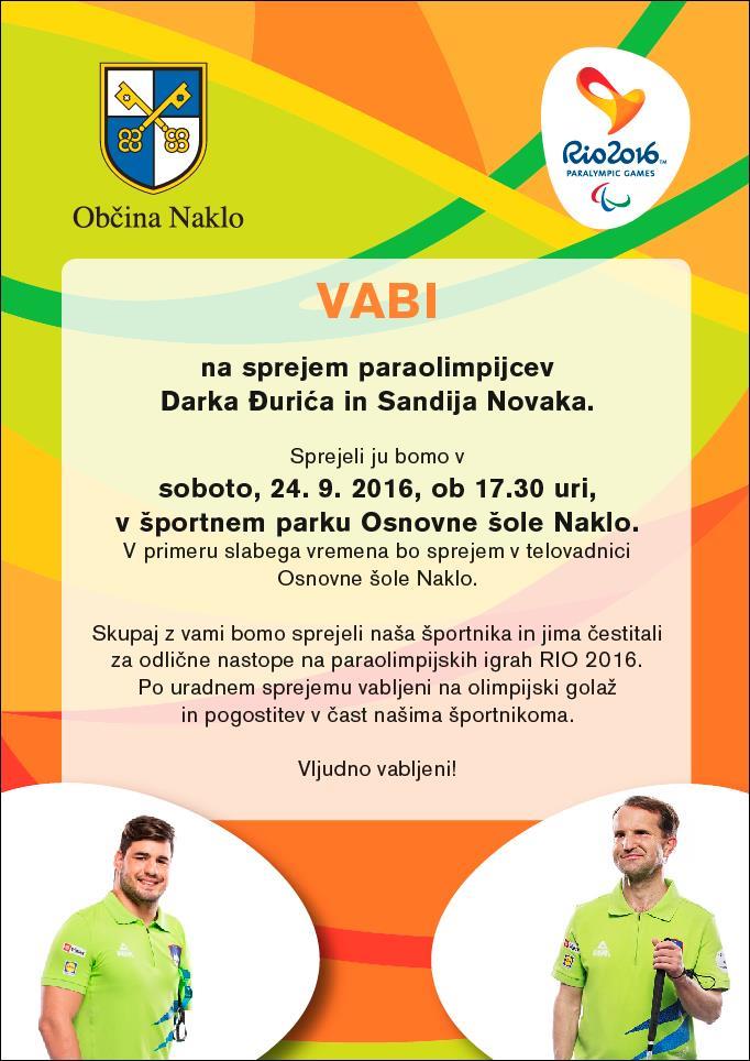 Skupaj z vami bomo sprejeli naša športnika in jima čestitali za odlične nastope na paraolimpijskih igrah RIO 2016. Po uradnem sprejemu vabljeni na olimpijski golaž in pogostitev v čast našima športnikoma.