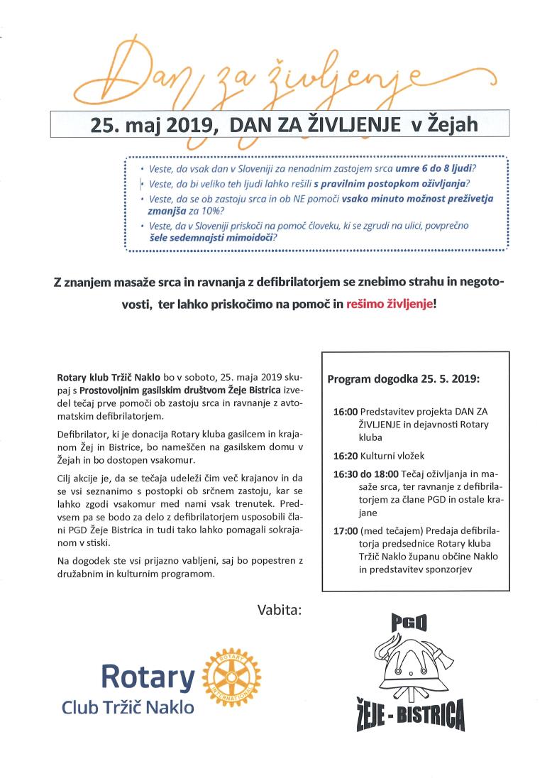 Rotary Club Tržič Naklo in PGD Žeje - Bistrica vabita v soboto, 25.5.2019, ob 16. uri, pred gasilski dom Žeje.