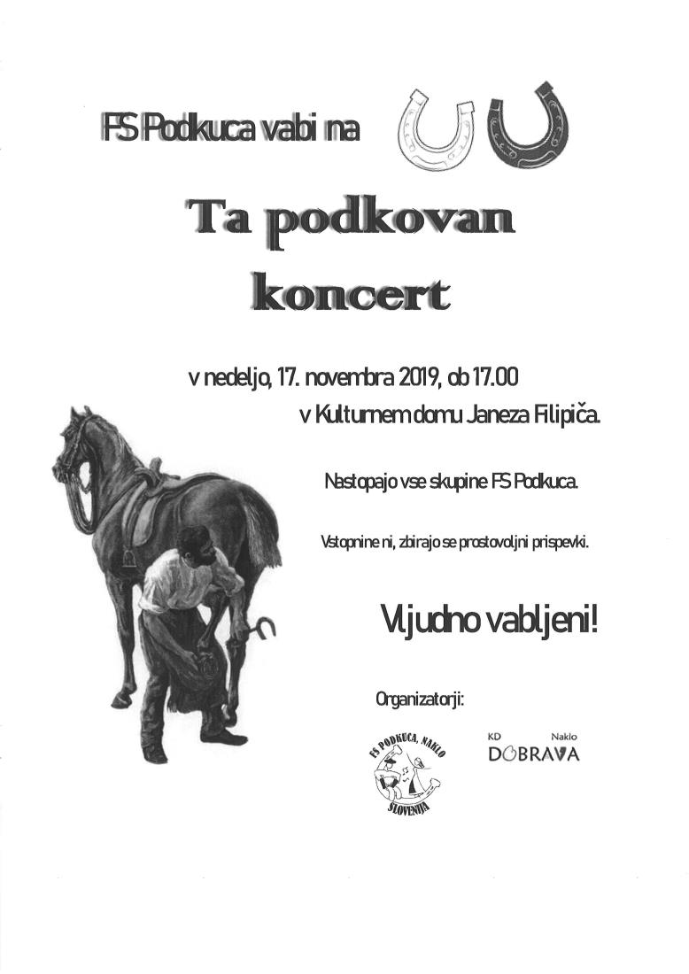 Folklorna skupina Podkuca vabi na "Ta podkovan koncert", ki bo v nedeljo, 17. novembra 2019, ob 17. uri, v Kulturnem domu Janeza Filipiča. Nastopile bodo vse skupine FS.