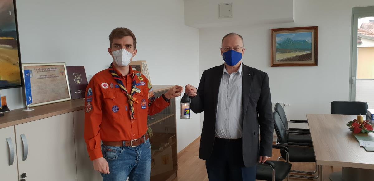 Prav poseben pa je obisk skavtov, ki tudi na Občino Naklo vsako leto prinesejo luč miru iz Betlehema. Letos zaradi korona krize ne hodijo v parih zato se je pri meni oglasil samo skavt Primož.