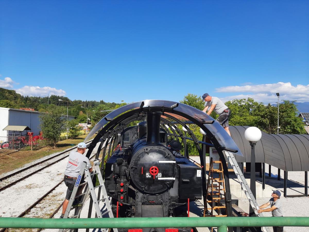 Obnovljena in zaščitena muzejska lokomotiva na postaji v Naklem