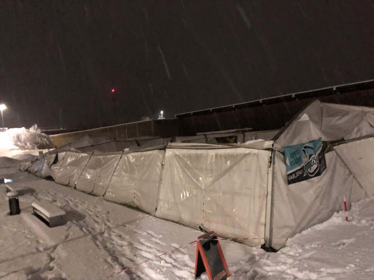Danes ponoči je na veliko veselje mnogih naše kraje pobelil sneg. Sneženje se je začelo po drugi uri ponoči, ko so padavine iz hudega naliva prešle v težak južni sneg. Pod težo snega je popustilo kar nekaj dreves, ki so padala tudi preko cest. Naše službe so sproti odstranjevale posledice padlih dreves. Žal pa je bil težak sneg usoden tudi za naš šotor v Mladinskem športnem parku. Ekipa, ki je dežurala v šotoru zaradi velikih količin težkega snega šotora ni uspela rešiti. Malo po četrti uri je konstrukcija šotora popustila. Zaradi odstranjevanja ruševin drsališče do nadaljnjega ostaja zaprto. Danes, preko dneva bodo ekipe iz Celja in naši gasilci začeli z odstranjevanjem. Po odstranitvi bomo drsališče ponovno zagnali. Hvala vsem za pomoč in sodelovanje.